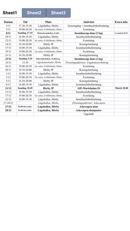 Just nu har vi uppehåll med laddning inför en intensiv period under vintern. Fr.o.m. 3/11 ska vi testa på att köra 3 träningspass/vecka med fys, konstgräs och Futsal. Dessutom blir det en hel del inomhuscuper samt en träningsmatch innan nyår. Se schema i bif. bild eller i kalendern här på sidan. Alla som vill komma och träna med oss är hjärtligt välkomna! Med vänliga hälsningar Henrik Svensson 070-6965099